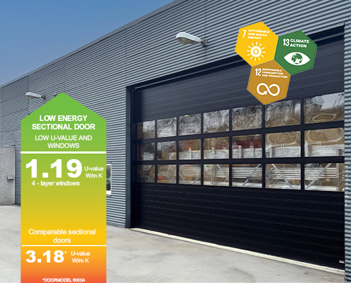 The new NASSAU 9000MI sectional door supports the green transition with its advanced insulation properties. The combination of highly insulating foam-filled sections and window sections with broken thermal bridges ensures minimal heat loss and maximum energy efficiency.